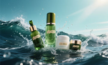 清新玻璃瓶置于虚拟自然水景中,花影轻舞,尽显清爽与清透感。