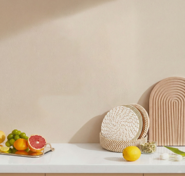 俯视角构图,清晨的北欧风格厨房转角处,阳光透过百叶窗在原木色中岛台表面投下精密的光栅图案,白色哑光橱柜与浅灰色水磨石墙面形成优雅过渡,台面上并排放置着藤编餐篮(内置新鲜法棍与彩色餐巾)、铜制量杯组、半切的牛油果与散落的蓝莓,壁挂式黄铜轨道灯垂下三盏磨砂玻璃罩吊灯,下方是悬挂的手工陶瓷餐盘与榉木砧板,窗台摆放着垂吊的佛珠吊兰与复古搪瓷水壶,整体色调为奶油白、燕麦色与原木棕的温柔交响,光线带有晨雾般的朦胧质感,细节处可见木质纹理与陶瓷冰裂纹理的自然肌理。