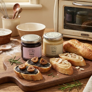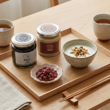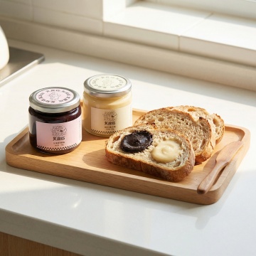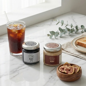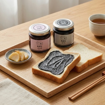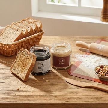 把图中的亚麻籽椰枣腰果酱和纯黑芝麻酱做成组合,然后生成合适的场景图,但是不要改变产品的原样。