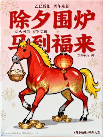 马年瓷板画,红马与童子共庆马年,鎏金文字与雪景交融,烟花绽放,喜庆梦幻。