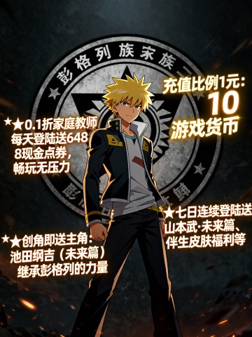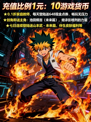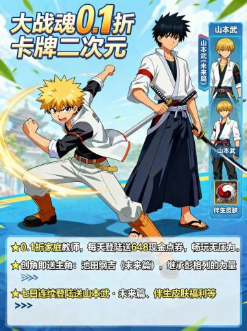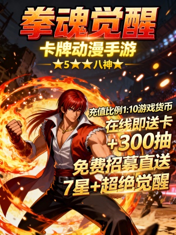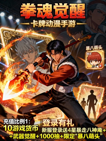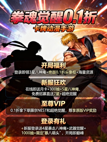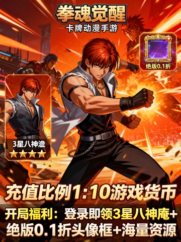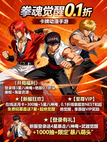 将以下文字生成3张宣传图片:‘拳魂觉醒0.1折’为正标题“卡牌动漫手游”为副标题 《开局福利》登录即领3星八神庵+绝版0.1折头像框+海量资源 ★【新服狂欢】在线即送月卡+300抽+5星八神庵,免费招募直送7星+超绝觉醒 ★【至尊VIP】0.1折拿下草薙京NEST和超绝觉醒,尊享原版VIP奖励! ★【登录有礼】新服登录送4星暴走八神庵+武器觉醒+1000抽+限定“暴八萌头”,开局即巅峰