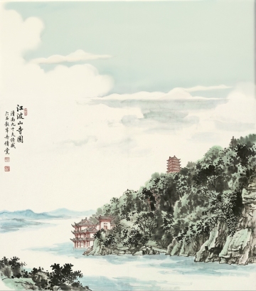 水墨山水,古典中式风格,淡雅悠远,山石树木相映成趣。