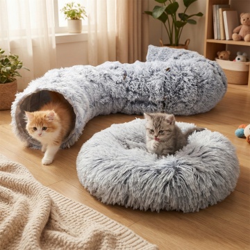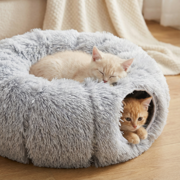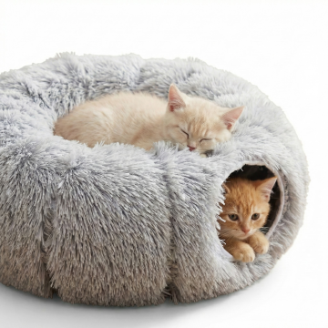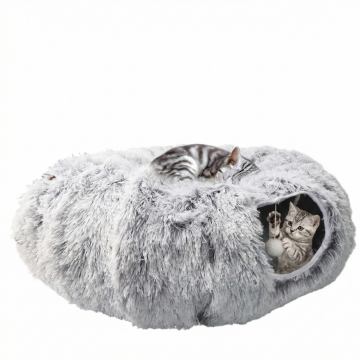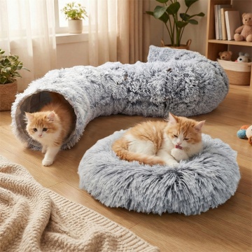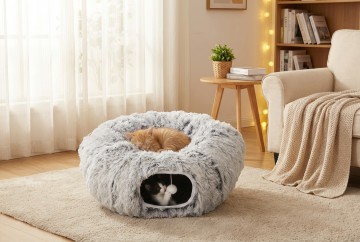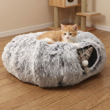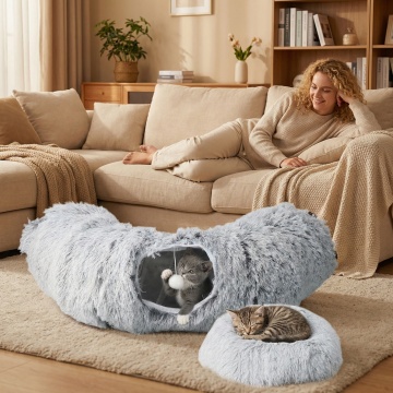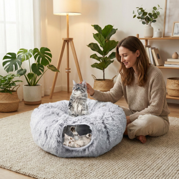 生一个外国女人躺在沙发上面看着猫窝上面的猫,将产品放在房间地板上,按照产品原本样式去生成