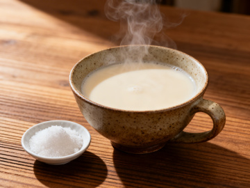 暖阳洒落,木纹桌面上热饮升腾,粗陶杯与细瓷碟呼应质朴东方韵,光影交织间,重拟物风再现东亚茶事静谧之美。