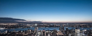 城市夜景,黄昏向夜晚过渡的深蓝色渐变天空,高楼大厦林立,玻璃幕墙反射着落日余晖与城市灯光,建筑群呈现出金属与玻璃的现代质感,街道上有流动的车灯轨迹,整体氛围宁静而繁华,远处天空有淡淡的云彩,光影对比鲜明,突出建筑的立体感和城市的纵深感。