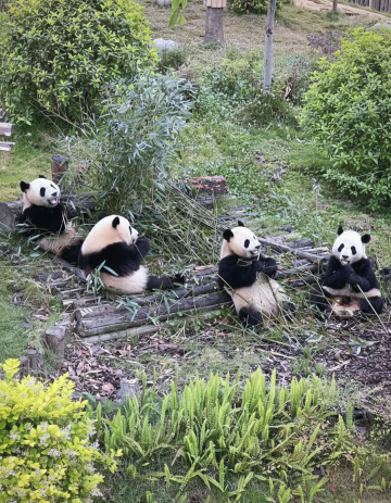 厚涂风拟人熊猫,清新实景竹林中,可爱啃竹,自然和谐。