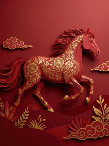 剪纸风与鎏金元素融合,国潮风格马匹踏祥云,红金配色尽显喜庆与古典韵味,寓意吉祥如意。