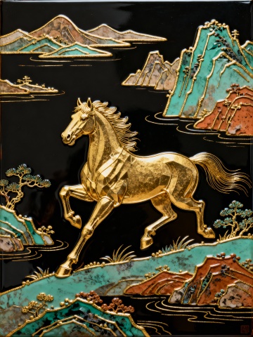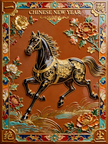 工笔风与浮雕风结合,鎏金描边勾勒骏马,中式复古奢华感十足,喜庆祥瑞迎新春。