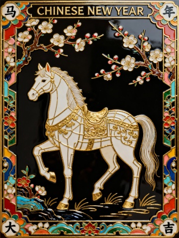 中式工笔浮雕风,鎏金描边勾勒白马祥瑞,粉金配色尽显奢华喜庆,松树流水点缀,寓意吉祥如意,春节氛围唯美优雅。