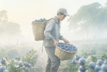 超写实摄影风格的蓝莓植株特写,饱满成熟的深蓝色蓝莓果实成簇挂在翠绿枝条上,叶片边缘清晰可见晶莹的露珠,晨露在阳光下闪烁着微光,背景是朦胧柔和的远山轮廓,天空呈现日出或日落时分的渐变橙黄色霞光,整体画面充满清新自然的田园氛围,光影层次丰富,细节质感细腻,色调和谐统一,营造出宁静而生机勃勃的清晨景象。