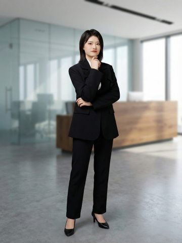 专业客服人员形象照,正面站立姿势,双手交叠于腹部,佩戴专业黑色头戴式耳机麦克风,身着黑色修身西装外套(单排双扣设计,左侧胸前口袋)与白色衬衫,黑色及膝西装裙,浅灰色纯色背景,柔和均匀的正面光源,清晰的面部光影过渡,自然微笑表情,职业干练的气质,高清商业人像摄影风格,锐利的细节,平滑的肤质处理,简洁大气的构图,人物居中且占据画面主要位置,展现专业、亲和、可信赖的客服形象。