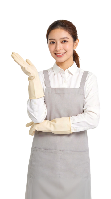 画面中间一位面带微笑的年轻保洁女性,左右两边留白。她梳着棕色马尾辫,妆容干净自然,眼神明亮且透着亲和力。她身着白色长袖衬衫,外搭浅灰色的工作围裙,双手佩戴亮蓝色的橡胶清洁手套;左手环抱于胸前,右手掌心向上、舒展地向外摊开,做出展示或邀请的手势,姿态专业又友好。纯白色背景