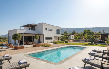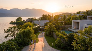 建筑外面增加一些人,泳池里面增加人游泳,建筑二楼增加人观光,不改变图片主要内容