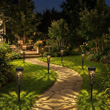 罐盖是黑色扁平的,顶部有一个太阳能电池板。罐子内发出温暖的黄白色灯光,营造出柔和的光晕效果。灯光足够明亮,清晰可见,表明照片可能是在黄昏或光线较暗的环境下拍摄的。