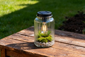 特写镜头拍摄了一个透明的带纹理玻璃罐,罐子里装有太阳能钨丝灯泡,放置在户外的木制桌面上,背景是绿色的草地。玻璃罐有垂直的凹槽或纹路,使其看起来很有质感。它呈圆柱形,肩部略微圆润,尺寸较高。罐子里装满了生机勃勃的绿色苔藓和细小的草叶,构成了一幅微型景观。底部铺着一层浅色的灰褐色小石子或粗砂砾。