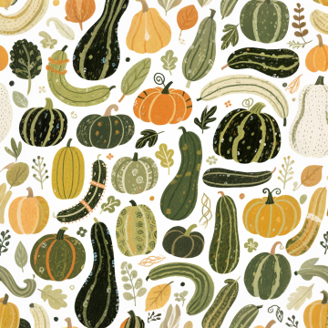 做一个冬瓜主题的循环图案,造型各不相同,复古线描风格,背景纯白,高端复杂,精美好看,做成印花形式,图案铺满