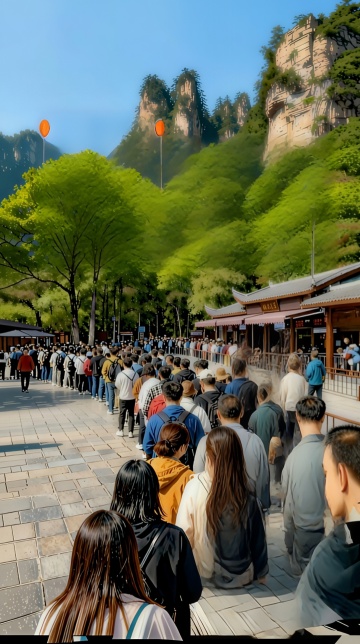 插画风融合实景感,厚涂技法呈现山间长队游人,水彩般清新色调呼应自然绿意,虚拟现实视角展现节日出行盛景。