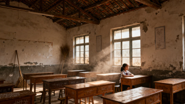 全景俯拍视角,在一座被晨光温柔唤醒的百年老校舍三楼走廊尽头,一间微微敞开着木门的教室正悄然诉说着时光故事——褪色的墨绿色黑板上用白色粉笔写着数学公式和几句潦草的励志格言,黑板边缘还挂着泛黄的世界地图,阳光透过爬满常春藤的玻璃窗,在地面切割出菱形光斑,光斑中漂浮着细小的尘埃。二十张核桃木课桌呈整齐的四列排列,每张桌面上都有深浅不一的刻痕,其中一张靠窗的课桌上,压着半块橡皮、翻开的语文课本(第三十七页的《从百草园到三味书屋》被阳光照亮),以及用玻璃瓶装着的野雏菊。教室后方的黑板报上用彩色粉笔绘制着"新学期新希望"的主题画,角落的饮水机旁堆着几个空水桶,墙角的老式吊扇正缓慢转动,在天花板上投下旋转的阴影,空气中弥漫着粉笔灰、旧书本和淡淡消毒水混合的味道,色调以温暖的赭石色木质纹理为基底,点缀着苔藓绿黑板与天蓝色窗帘的清新对比。