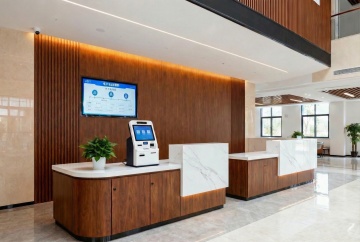 以“康雅Ai健康小屋”为牌匾,进店内首先第一个区域是前台接待区,前台旁边有两张圆桌与桌椅,有位接待人员在前台看电脑;店内第二个区域为AI检测区,设置智能检测设备与座椅,旁边墙上有个“康雅云门诊”的大屏;第三个区域有舱体理疗区域,老年人可躺着体验设备理疗;第四个区域是会议室。整体风格清新典雅,适合健康行业。