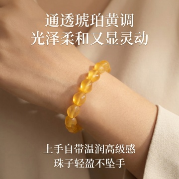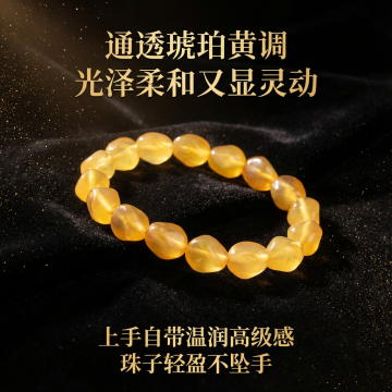 这张图片是产品主体这款产品是蜜蜡手串 我需要设计10张主图在拼多多上面售卖 主图设计整体显得高级一些 主图文案内容 通透琥珀黄调 光泽柔和又显灵动 上手自带温润高级感 珠子轻盈不坠手