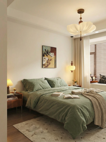 现代简约风格卧室,以米白色和浅木色为主色调,柔和的暖黄色间接光源(天花板灯带、床头壁灯)营造温馨宁静氛围。中央是一张铺着米白色床单和浅棕色针织毯的双人床,床头有两个白色靠枕和一个带褶皱装饰的抱枕。床的右侧是浅木色床头柜,上面放着一盏白色台灯和一本翻开的书。床尾铺着浅灰色地毯。左侧靠墙有一个浅木色开放式书架,摆放着绿植、装饰品和书籍,书架旁有一把浅色扶手椅和小圆几。背景墙挂着一幅花卉装饰画和两朵立体花瓣装饰。落地窗挂着米白色半透明窗帘,透进柔和自然光,整体空间明亮通透,布局对称平衡,材质上融合了布艺的柔软与木质的温润,细节精致,线条简洁流畅。