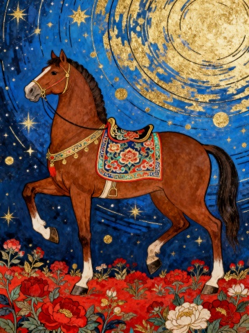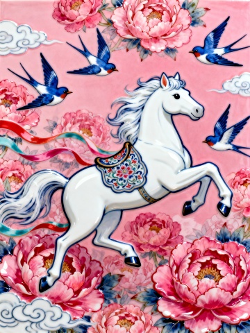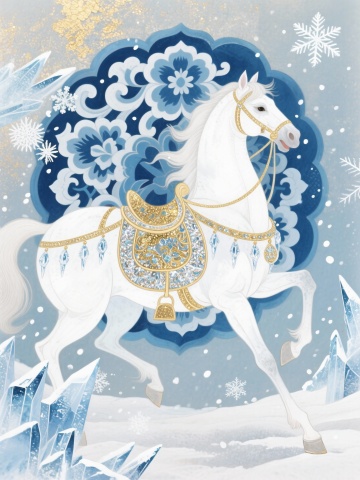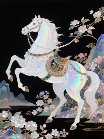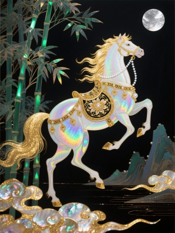 梦幻光影下的白骏马,融工笔风与国潮元素,鎏金刺绣点缀,极繁主义构图,尽显奢华唯美与古典优雅。
