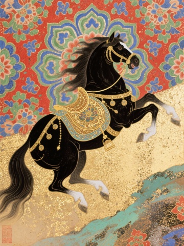 工笔与岩彩交融,鎏金勾勒骏马华纹,融合中式民族元素,喜庆祥瑞,尽显复古雅致。
