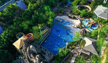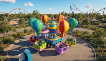 我上传的图片是游乐设备时空战机,帮我合成一个场景、超写实摄影、远景、专业相机拍摄的图片,是晴天、时空战机在美国的度假村中正在运行,设备右边座舱上座满了小孩,设备放置在水泥硬化地面,8k超高分辨率,微距细节,极简主义工业美学,菲涅尔反射效果,生成的图片全部显示