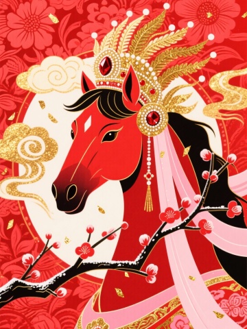 一匹姿态昂扬的骏马,身披红色绸缎,鬃毛和尾巴飘逸,马蹄踏在金色祥云上,周围环绕着红灯笼、中国结和金色烟花,背景是淡红色渐变,整体风格喜庆吉祥,充满新年氛围