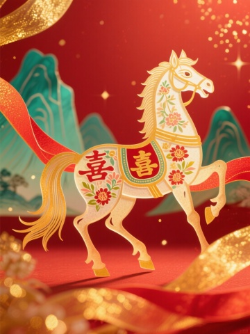 主体是一匹饰有剪纸纹华丽鞍具的红色剪纸奔马,背景为红金相间的宝相花纹样,周围环绕剪纸灯笼与窗花元素,整体呈现传统年味的国潮风格。