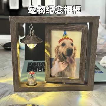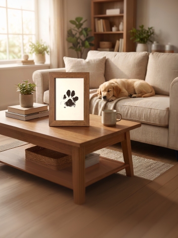 放在客厅桌面上,背景有一个沙发上面有一只小狗趴着