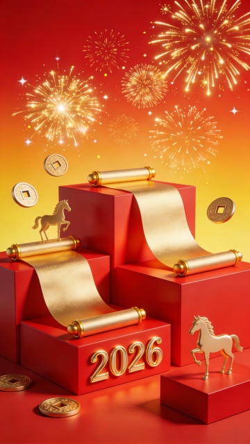 3D写实风,视觉中心是一台老虎机造型装置(悬空,正面视角,金属材质金红配色,机器上装饰“2026”立体数字、小金马,机器中部装饰“Happy New Year”黄色小字,机器底部吐出大量金币),机器滚轮区转出图中商品。背景是红色光泽幕布,周围散落金色碎片。顶部金色3D灯牌标题“加马年货节”,副标题3d金色小字“全场满200减100”。