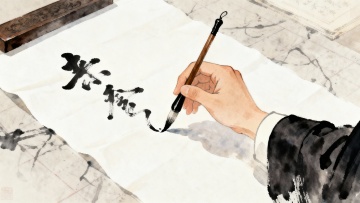 中国风传统毛笔插画,一支精致的毛笔斜向摆放,笔杆为棕红色木质,带有金色环形装饰,笔头为黑色鬃毛,笔尖锐利,毛笔下方是水墨在宣纸上晕染开的黑色墨团和飞溅的墨点,呈现出自然的书法笔触效果,整体风格简约典雅,具有浓厚的传统文化气息,画面背景为纯白色,突出毛笔与水墨元素的主体地位,线条流畅,墨色浓淡变化自然,营造出宁静古朴的东方艺术氛围。