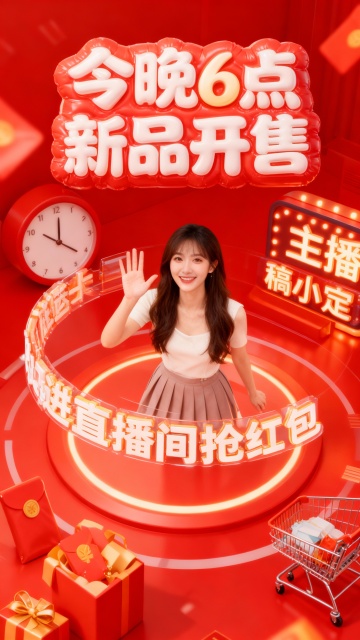 3D充气风大字搭配霓虹灯效,红金配色营造喜庆促销氛围,主播互动引导直播抢红包,视觉冲击力强,节日感十足。