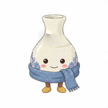 一个卡通风格的花瓶插画,花瓶主体为蓝色轮廓,内部填充柔和的淡紫色,脸上带着黑色圆点眼睛和微笑的弧线嘴巴,脸颊有粉红色圆形腮红,脖子处系着一个大的橙色蝴蝶结,蝴蝶结中心有白色圆点,花瓶中插着四朵花,花朵轮廓为深蓝色,花瓣填充淡粉色,花心为黄色圆形,周围有绿色的椭圆形叶子和橙色的十字形装饰图案,整体线条简洁流畅,色彩以紫色、橙色、粉色为主,保持原有的可爱、欢快氛围和扁平化设计风格。