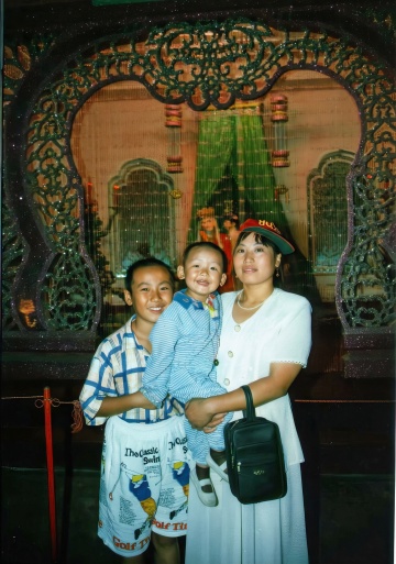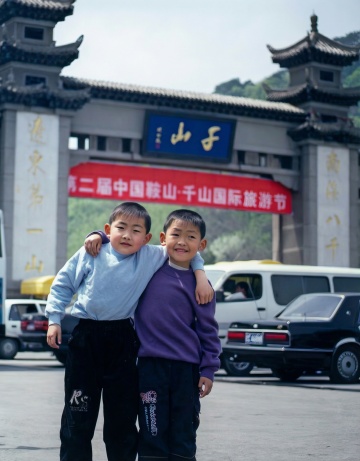 以超写实、超细致的16K单反质量修复照片。修复划痕、撕裂、噪点和模糊。保持自然肤色的同时增强鲜艳色彩。完美锐化面部、头发和衣服细节。增添逼真光影和景深。专业级PS后期处理。高动态范围,超高清,逼真纹理,电影般仕后,清晰干净背景,完全还原和提升原照片,提升人物亮度,男孩穿灰色运动鞋,女孩穿红色小皮鞋