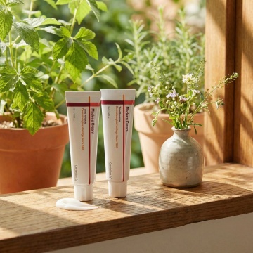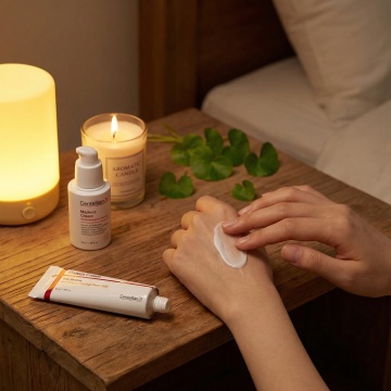 根据图中产品再结合一下提示词生成八张不一样的产品图- 专业院线风:产品置于浅灰色医美级背景上,管身倾斜45°,突出“Dermatological Heritage Since 1968”字样,冷调柔和光线,营造专业、安心的护肤氛围。右侧排列三枚认证徽章,整体构图简洁有力,突出医学护肤与抗衰修护卖点。 2. 氛围感场景图(社交种草+代入感) - 夜间修护场景:Centellian24抗衰面霜放在木质床头柜上,旁边搭配同品牌精华、香薰蜡烛与暖黄小夜灯。手取面霜轻抹在手背,柔焦暖光营造治愈氛围,突出夜间抗衰修护的仪式感。背景点缀积雪草叶片(呼应成分),强化产品天然修护力。 - 极简ins风护肤台:白色软管面霜置于米白色大理石台面上,搭配透明玻璃杯与新鲜积雪草,自然光柔和洒落,整体色调干净柔和。管身红橙线条成为视觉亮点,突出产品温和抗衰、适合敏感肌的特点,画面松弛治愈。 3. 成分与质地图(放大核心卖点) - 质地特写:白色软管挤出绵密乳霜质地,指尖推开后呈现水润光泽,柔光捕捉细腻肌理,背景为纯净浅灰。特写积雪草叶片与面霜同框,突出产品修护抗衰的核心成分,画面干净有说服力。 - 成分可视化:面霜质地特写,周围环绕半透明积雪草活性分子特效,冷光背景下凸显成分活性与修护力。软管包装一角入镜,强化品牌识别,适合突出科技抗衰的内容场景。