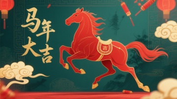 国潮风插画,红马奔腾,鎏金祥云与灯笼点缀,剪纸元素融合中式纹样,喜庆吉祥,尽显民族韵味。