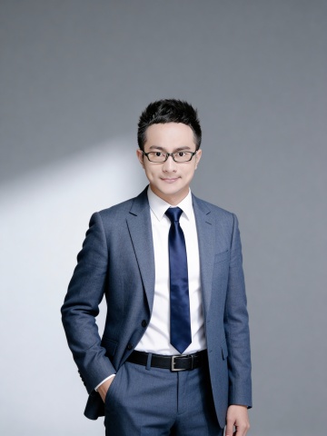 保留人物脸型、发型、年龄特征生成标准职场形象照,50MM焦段,F/4光圈(F/2.8-F/4区间),相机与人物距离3米,横向16:9比例(左右预留环境空间),人物占画面60%,入镜头部至膝盖上方5CM,平视视角,人物居中构图,头肩比例协调,身穿深墨蓝色西装,内搭白色衬衫,精致且高级的深蓝色斜向微微渐隐光泽感极细条纹商务感领带,下装黑色西裤搭配黑色皮带;正面抱胸姿态,肢体舒展的站立姿态,自信从容;主