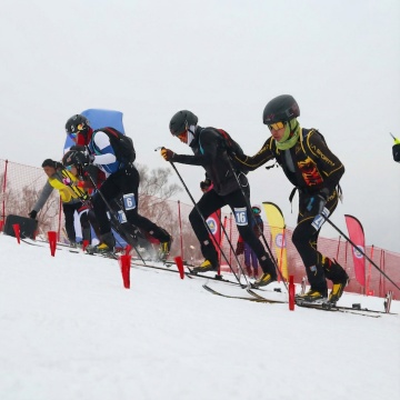 这是一个动画片的开幕照片,用于生成视频,图片是个大型滑雪场的场景滑雪者纷纷秀着各自的滑雪技能。要求场面震撼,滑板溅起的雪飞扬,要有电影级的光效,大片的既视感。