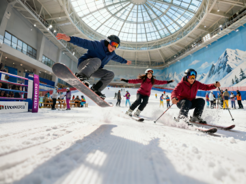 现代感室内滑雪场,3D混合材质风呈现光影与运动交织的酷炫场景,重拟物设计增强实景感,科技感穹顶映衬清爽雪趣。