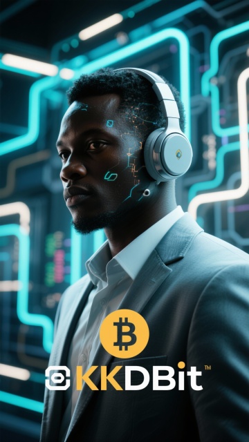 Congolese professional holding a futuristic transparent smartphone displaying the KKDBit trading app interface. Floating UI elements show wallet balance, candlestick charts, and market prices. Dark cyber environment with moving code, glowing particles, and digital light trails. Professional lighting, modern crypto innovation feel, ultra-HD, vertical orientation, 9:16.