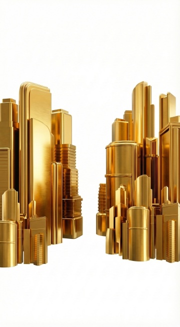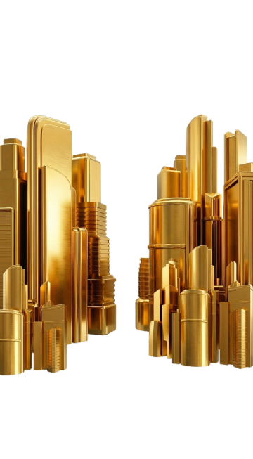 金色金属质感背景,表面带有细腻的磨砂纹理和柔和的光泽渐变,整体呈现出温暖而奢华的视觉效果,融合现代城市景观剪影,建筑轮廓简洁而富有线条感,与金色背景形成和谐统一的整体氛围。