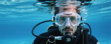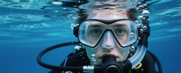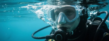写实风格的水下摄影照片,清澈透明的蓝色水域,水面波光粼粼,阳光透过水面形成明亮的光束,照亮水中悬浮的细小气泡,底部呈现自然的水波纹光影效果,整体画面宁静、通透,充满梦幻般的光影氛围,色彩以深浅不同的蓝色为主调,光影对比柔和,细节清晰,具有真实水下环境的质感和视觉效果。