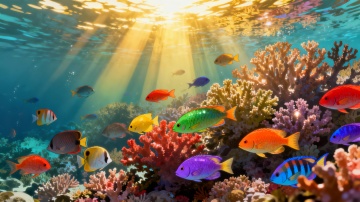 超写实风格水下场景,阳光穿透清澈湛蓝海水形成多束明亮光束,照亮海底五彩斑斓的珊瑚礁生态系统。前景是形态各异的健康珊瑚群落,包括巨大的红色脑珊瑚、橙色扇形珊瑚、紫色鹿角珊瑚和黄色块状珊瑚,珊瑚表面细节丰富,纹理清晰可见。中央区域有一条姿态优雅的蓝白条纹小丑鱼群和几条黄色与黑色相间的蝴蝶鱼,周围环绕着银色闪光的沙丁鱼群和几只色彩鲜艳的鹦鹉鱼,所有海洋生物动态自然,细节精致。背景海水呈现出由浅至深的渐变蓝色,水面有轻微波纹和光斑反射,整体画面光影对比强烈,色彩饱和度高,营造出梦幻而生机勃勃的热带海洋氛围,具有极高的摄影级清晰度和真实感。