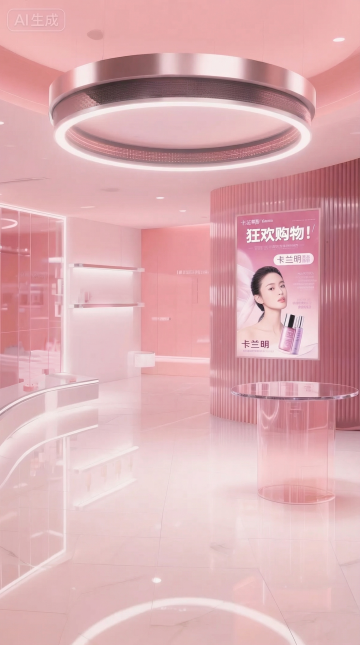 3D rendering of a modern, minimalist live broadcast room background with a warm beige and gold color scheme, featuring smooth curved walls, vertical gold ribbed panels, recessed LED strip lighting, a circular ceiling light fixture with a golden trim, glossy white flooring, and floating shelves with a small camera-like device; designed with a clean, elegant aesthetic, soft ambient lighting, and a focus on creating a professional yet inviting atmosphere for live streaming, presented from different angles and with varied shelf arrangements.
