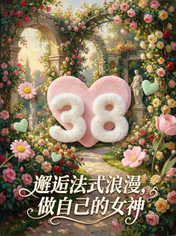 油画风融合重拟物与插画元素,以欧式宫廷花园为背景,柔美光影交织浪漫花海,毛绒质感“38”心形数字凸显甜蜜与体积感,演绎法式优雅的梦幻女神节氛围。