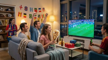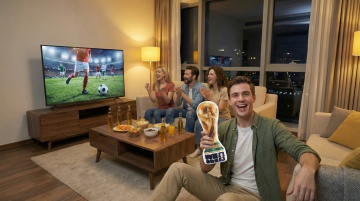 软3D风格融合科技感与温馨感,卡通家庭围坐沙发,置身未来都市,霓虹灯辉映AI字样,传递虚拟现实中的团圆温情,双节专属氛围浓厚。