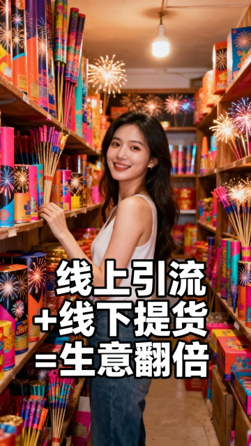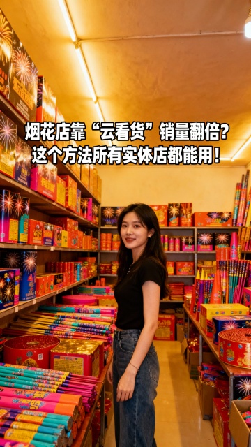 美女在琳琅满目的烟花店,字幕: 简单一步,打通线上线下一体化。