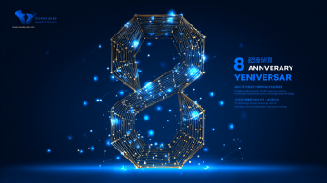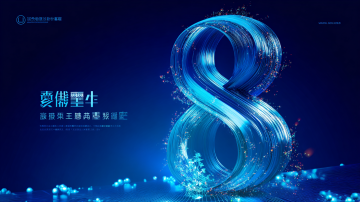 未来感科技风数字“8”,3D几何线条交织,鎏金金属质感,蓝色粒子光影流动,虚拟现实空间氛围,庆祝八周年纪念。